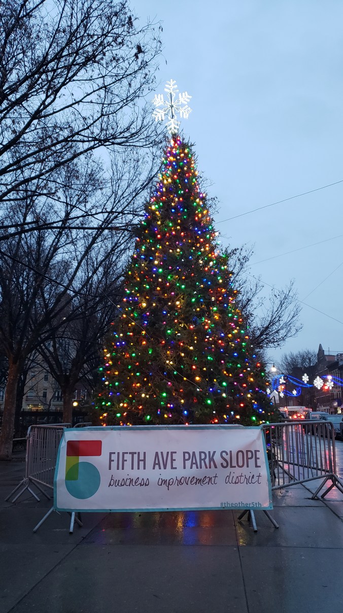 Mi barrio, no iba a ser menos. El árbol se instala con bastante antelación en la Quinta Avenida de Brooklyn, con visita de Santa Claus incluida.