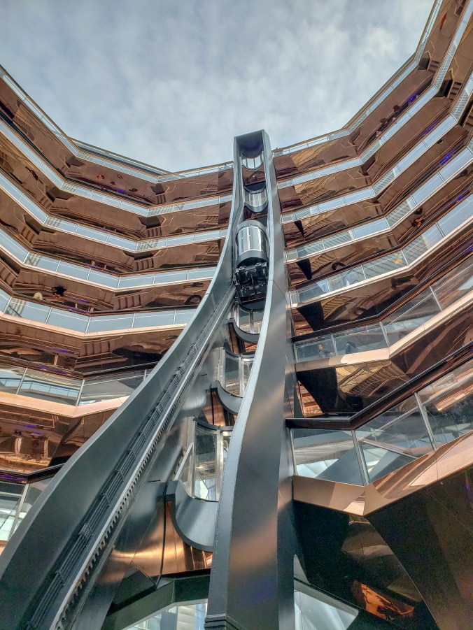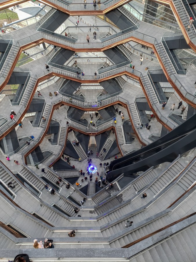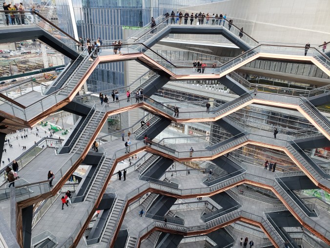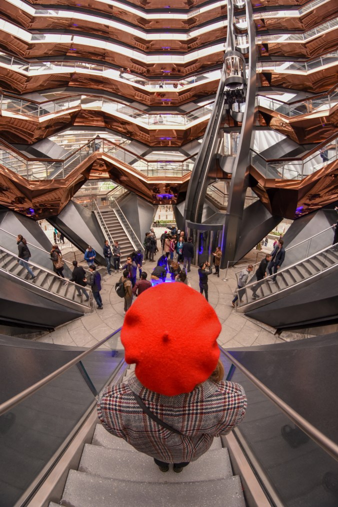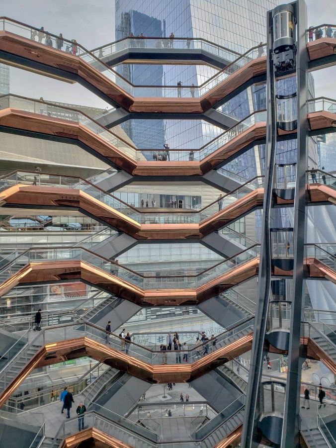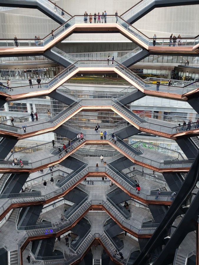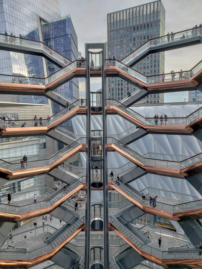 Esto se refleja en el nuevo barrio surgido de al final de la High Line, llamado Hudson Yards. Lo más representativo de este barrio, al que aún le quedan algunas construcciones por finalizar para ser completo, es The Vessel (a parte de, que bajo mi punto de vista, es un barrio diseñado para la gente con cierto poderío económico, pero está claro que eso no quita que el resto de los mortales vayamos por allí también). ¿Qué es The Vessel? Se trata de una especie de escultura llena de escaleras (creo que hay aproximadamente unas 150) todas ellas conectadas y con numerosas plataformas de observación, en las que puedes pararte para ver esta obra arquitectónica desde diferentes puntos de vista. Debes ir, no por las vistas, sino por las diferentes perspectivas que puedes conseguir de The Vessel. Personalmente, al principio era un poco escéptica con esta “escultura” ya que, durante su proceso de construcción, me parecía un poco “rara”, por decirlo de alguna manera. ¿Son realmente vasos sanguíneos? ¿Es un enjambre de abejas?…Al final, es la interpretación que tú, y solo tú, le quieras dar. Debo de admitir, que, una vez dentro, el concepto me pareción muy interesante y, me llamó mucho la atención. También, me llamó mucho la atención la gente que se mostraba hiper-asustada por el vértigo y se agarraba a las barandillas como si les fuese la vida en ello, ya que en ningún momento estás expuesto a caerte o nada parecido, pero los miedos, son incontrolables. Claro está.