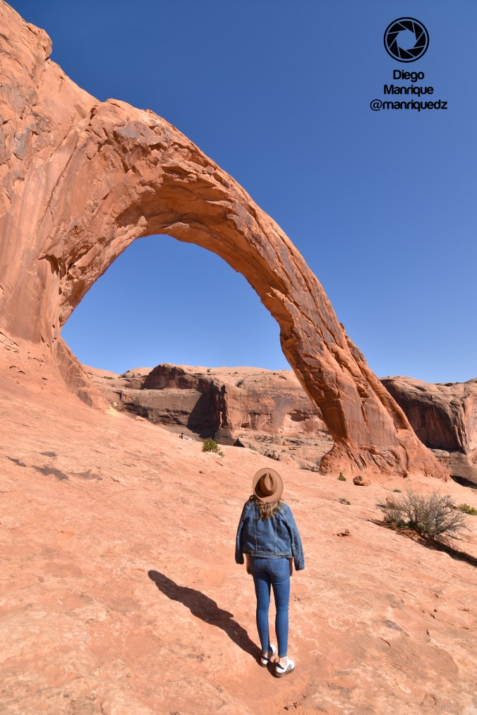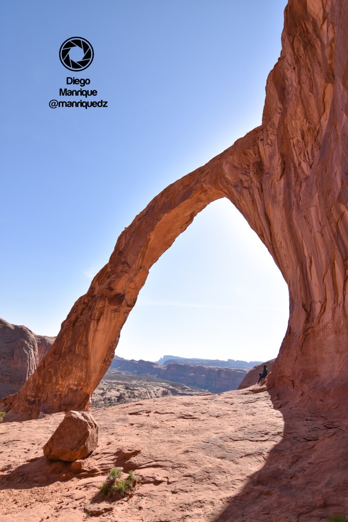 Como he dicho, Dead Horse Point te permite “jugar” con el horario. Nosotros pasamos la mañana allí y, una vez comimos nuestro picnic, nos dirigimos a ver unas fuentes de potasio, atravesando la Potash Road, donde podrás ver infinidad de gente practicando la escalada en sus paredes casi verticales. Después, fuimos a hacer el hike del arco natural Corona Arch , como veis, no todos los arcos están en el parque de Arches. Esta ruta es moderada, 5 kilómetros ida y vuelta, con cuestas y pequeñas subidas. Merece la pena, el arco es digno de ver por sus dimensiones y forma.