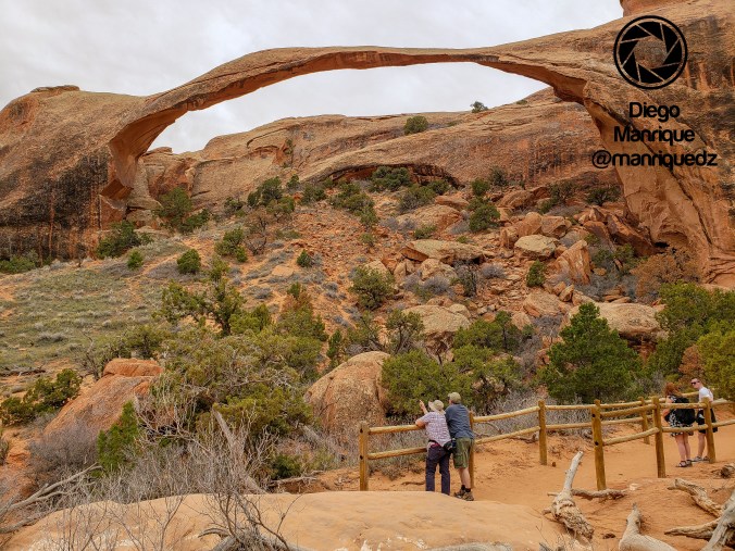 El plato fuerte y, lo que más estuve esperando todo el día, fue el Delicate Arch. Para acceder, hay que hacer un pequeño hike, sin dificultad ni peligros. Decidimos ver el atardecer desde esta parte del parque. Después de un día sin nubes, la tarde cambió. El cielo se nubló y el gris era el color predominante. Nuestro gozo en un pozo. Con esas condiciones, no habría atardecer. Eso pensábamos. Y, seguramente, eso pensaba la mayoría de las personas que hasta allí se habían acercado. Como he dicho, caminamos hasta allí, con tiempo, hicimos fotos y esperamos al atardecer aunque sin muchas expectativas.