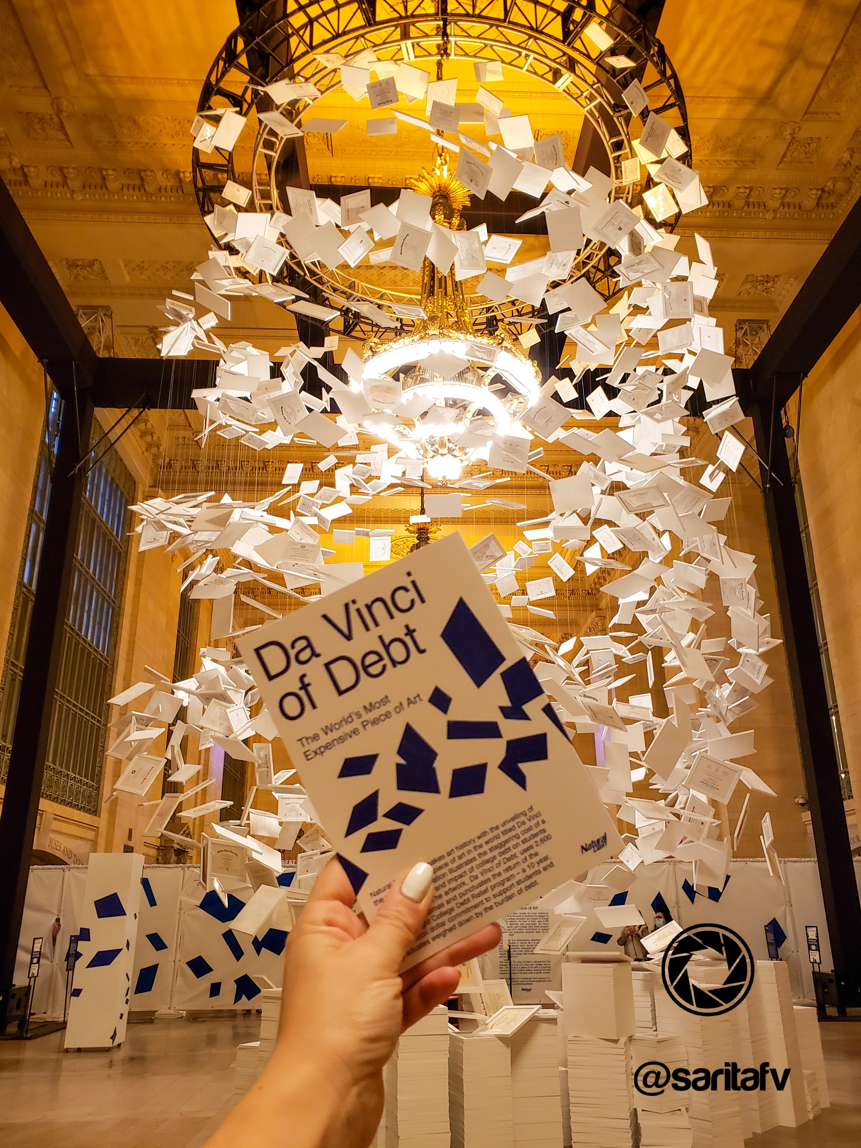 Esta instalación muestra el excesivo coste de la educación universitaria en este país y el impacto que la deuda creada a causa de esto tiene en los estudiantes y graduados. Da Vinci of Debt usa 2.600 títulos universitarios, AUTÉNTICOS, para esta pieza. La empresa Natural Light Beer, de quien ha salido todo esto, tiene un programa de ayudas universitarias, de hasta 10 millones de dólares, que sirve para aliviar los gastos de los estudiantes y los ya graduados que están asediados por la deuda que conlleva en este país tener una educación superior.