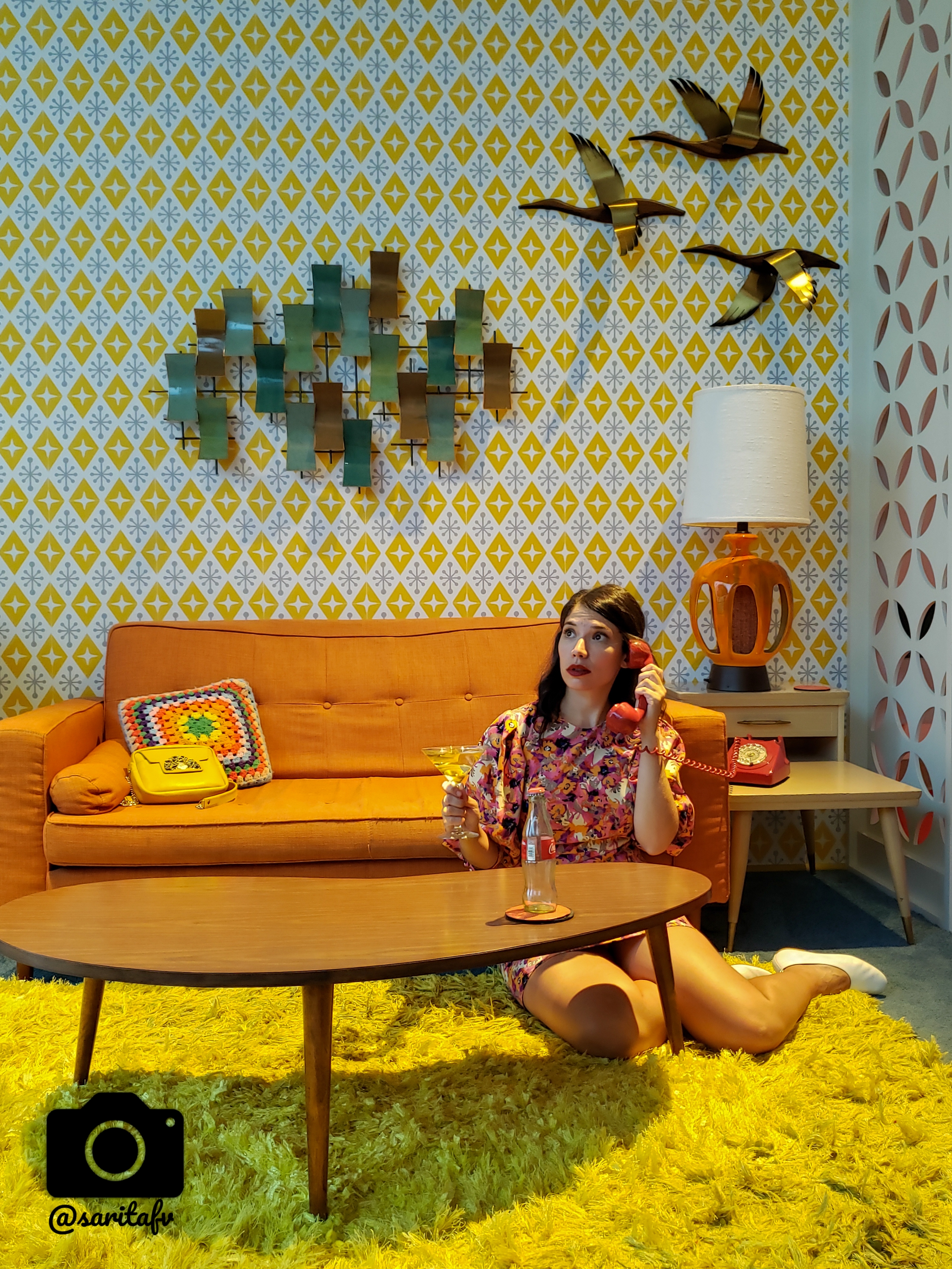 En una recreación de una sala de estar de 1962, se anima a los huéspedes del hotel a observar la moda retro, jugar con una “Barbie Dreamhouse” original y disfrutar de los muebles de aquella época.