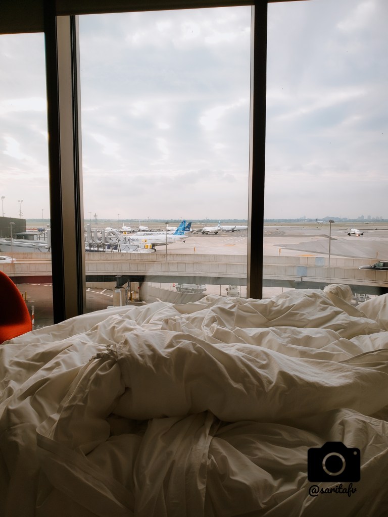 Casi 20 años más tarde, en Mayo de 2019, el edificio reabría como TWA Hotel, convirtiéndose en el primer hotel que se encuentra dentro del complejo del Aeropuerto JFK. Como podréis imaginar, tener un hotel en medio de un aeropuerto con aviones despegando y aterrizando puede ser extremadamente ruidoso. Obviamente, el control de ruido se incluyó en el proyecto de restauración. El hotel cuenta con muros de cortina de vidrio que son los segundos mas gruesos del mundo, justo detrás del muro de la Embajada de los Estados Unidos en Londres. Para que nos hagamos una idea, este nivel de insonorización asegura que las ventanas de ancho completo, del suelo al techo, cancelan el ruido de la pista. Y os lo aseguro, no se oía ni un ruido. Verás los aviones moverse por la pista, despegar…pero en ningún momento oirás nada.
